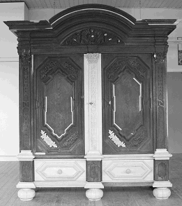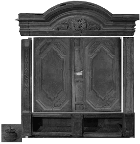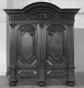 Ursprünglich war das Wort "Schapp" in der allgemeinen norddeutschen Umgangssprache der Begriff für einen Schrank. In der heutigen Fachterminologie bezeichnet man mit ihm einen "bürgerlich, repräsentativen Kleiderschrank" im Bereich des norddeutschen hansestädtischen Hochbarocks. Der Erhaltungszustand des Schrankes, dessen verbliebene Bauteile im Magazin eines Museums vor sich hin dämmerten, durfte als ausgesprochen schlecht bezeichnet werden. Andererseits war, wie nebenstehendes Bild zeigt, doch so viel Substanz vorhanden, dass es nahe lag, ein Kulturgut dieser seltenen Art wieder der Öffentlichkeit zugänglich zu machen. |