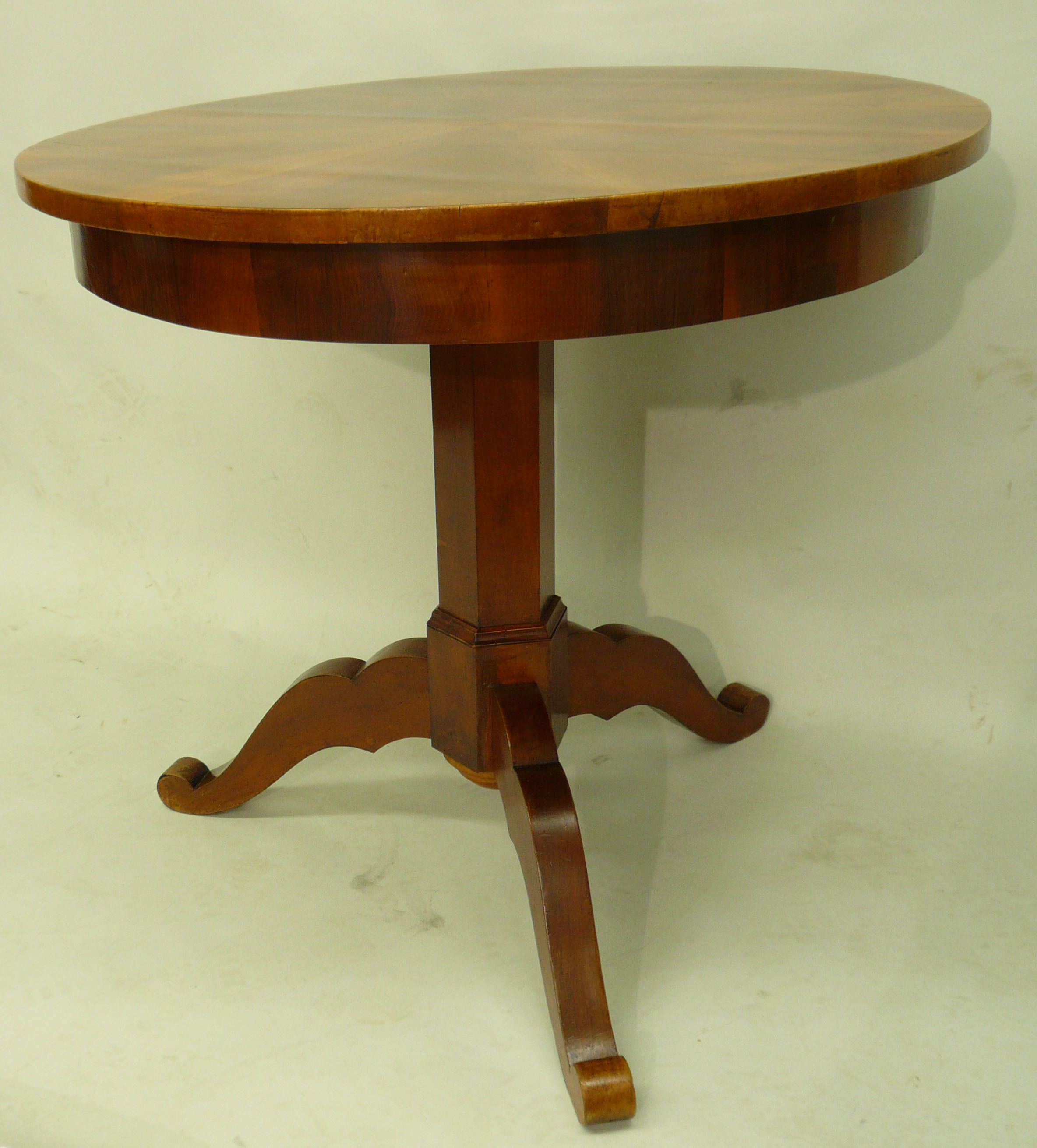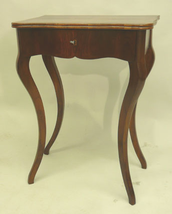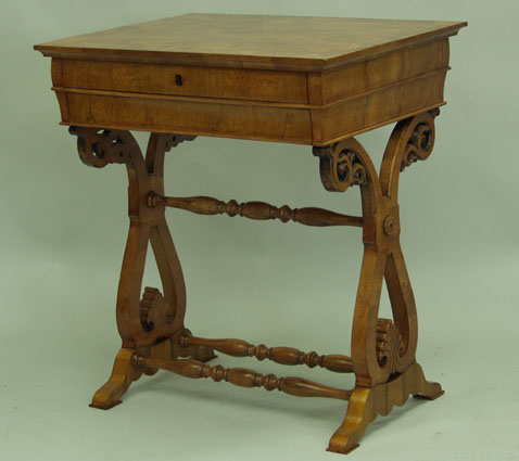 Nussbaum furniert, um 1860, mitteldeutsch Maße: Höhe 80 cm, Breite 58 cm, harmonisch, elegante Form, unauffällig eingearbeiteter Schubkasten Preis: € 1.180.- |